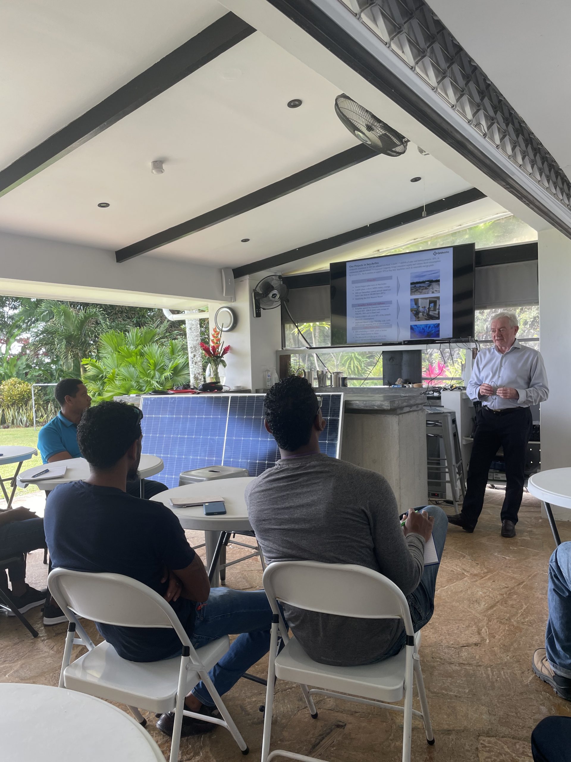 Joe and Axel led the sessions at the British High Commission in Mahe and covered topics including PV system components and their functions, installation best practices, commissioning and testing, and operations and maintenance.
